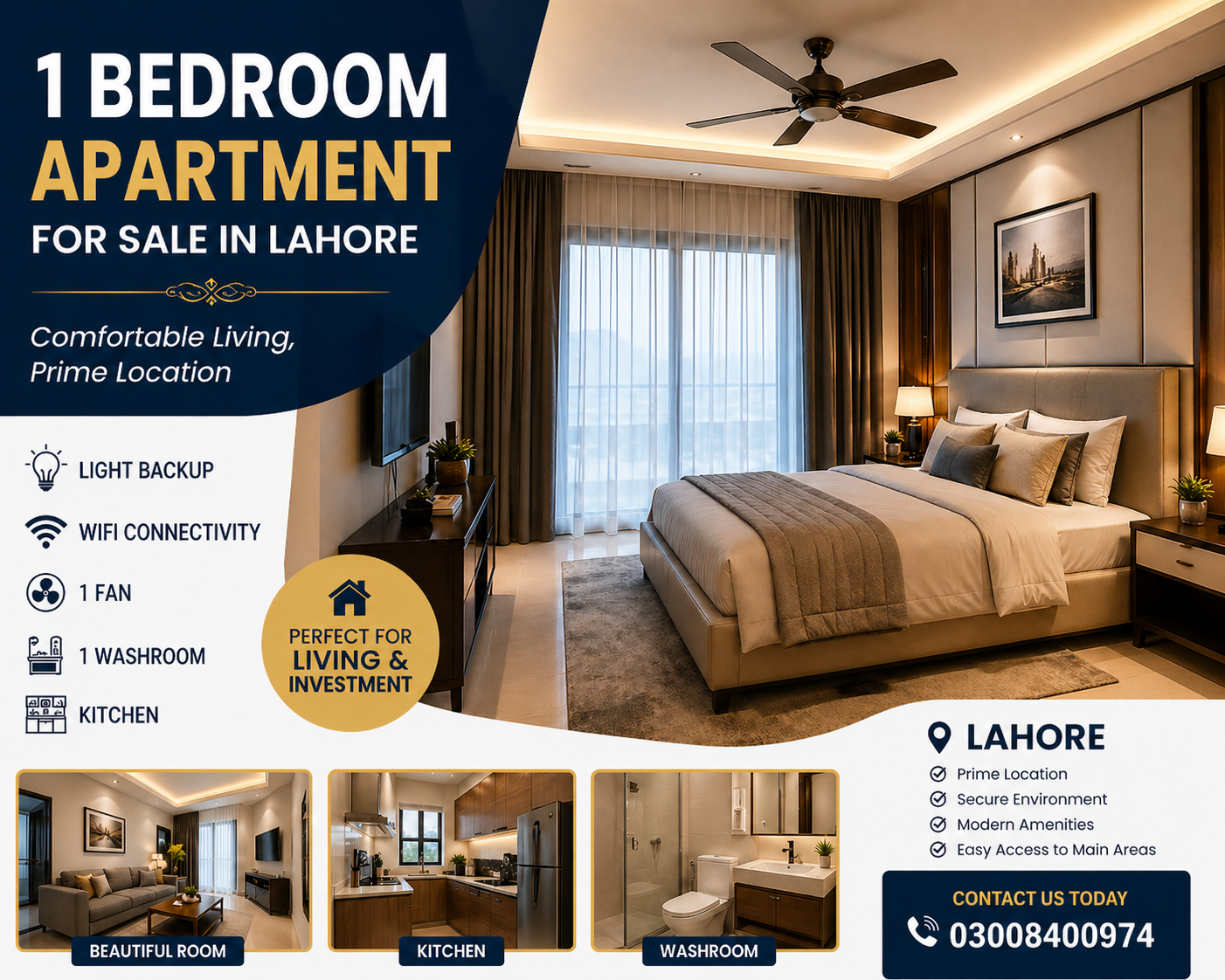This apartment has a beautiful and spacious bedroom with a modern look and good natural light. It includes a clean washroom with essential amenities. The kitchen is properly arranged, making it easy to cook everyday meals. The apartment also comes with useful amenities like backup lighting, Wi-Fi connection, and a ceiling fan for added comfort. The living area is cozy and perfect for relaxing after a long day. Located in a good area of Lahore, these apartments are