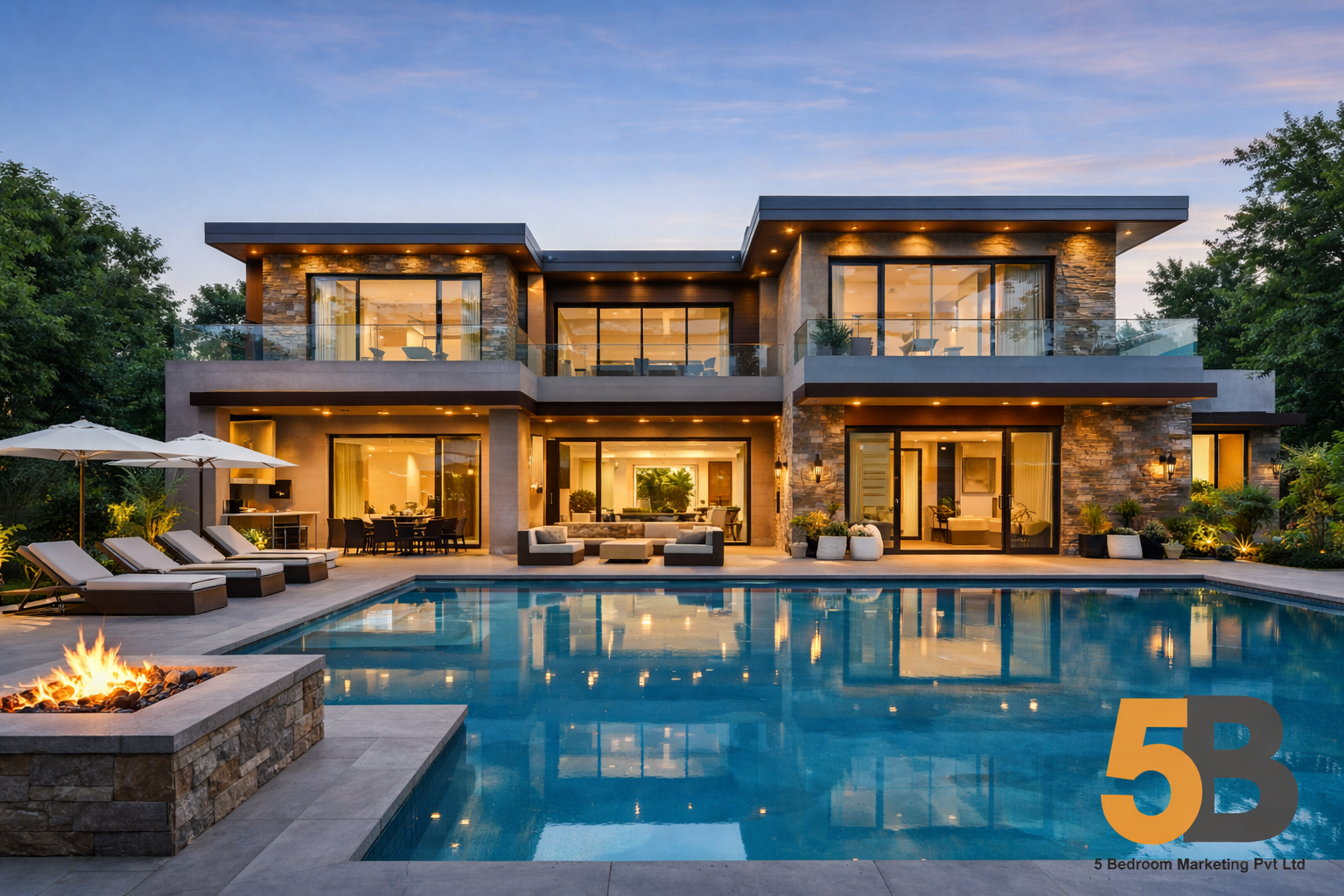 5–6 large bedrooms with attached baths, Stylish American-style kitchen